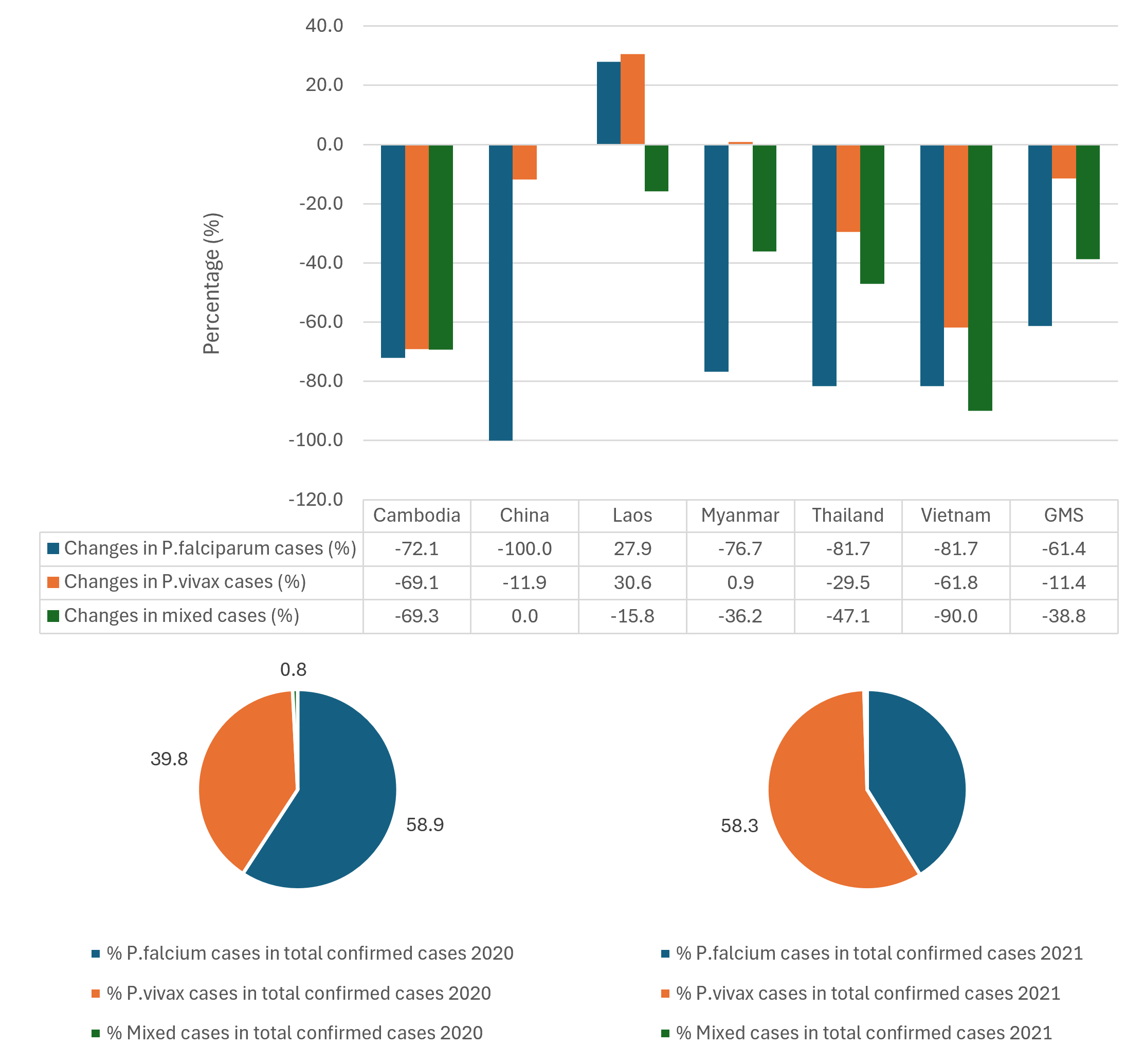 As previously noted, P. falciparum shows an extensive capacity to evolve under the selective pressure of suboptimal treatment with antimalarials to become drug-resistant. Notwithstanding this concerning characteristic, in five out of six GMS countries the number of P. falciparum infections declined by 61.4% from 2020 to 2021 (Figure 10). China achieved the P. falciparum elimination goal in 2021 and was closely followed by Vietnam with an 81% drop. Likewise, incidence of P. vivax also experienced an overall downturn, despite being easily transmissible and challenging to control (Howe et al., 2016). Cambodia’s national strategy limited the spread of P. vivax, demonstrated by a substantial contraction by 69.1% in case numbers, and similarly successful in Vietnam, which observed a 61.8% decrease. While the proportion of P. falciparum-related cases decreased in 2021 compared to 2020, the reverse was true for P. vivax infections. This pattern demonstrates that P. falciparum elimination is well-focused and achievable by 2025. Nonetheless, it is recommended that the Vietnamese Government invests more attention to combat P. vivax, an extremely hard-to-control species. Combining all available data as a measure of efficacy, the NMCEP is working well towards achieving WHO targets. Furthermore, since most GMS nations are approaching the malaria elimination phase, collaborative support through continuous integration of cross-border surveillance systems is necessary, together with efficient local processes for investigation and emergency responses within each country.