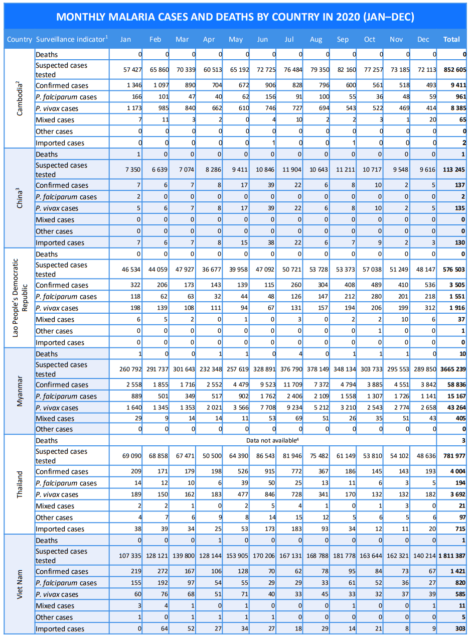 In general, all six GMS countries are working well towards the malaria elimination target set by the most recent strategy for the period 2015–2030. Encouraging results also provide motivation for this subregion to make progress in preventing the spread of malaria through concrete actions such as drug efficacy monitoring and local modifications to the national plan. In the most recent WHO statistics for the status of MME countries, only nine months (January–September) in 2021 are available; hence, the same period of 2020 was used as a comparator. A combined 20% reduction in malaria incidence, from 61,307 in 2020 to 48,647 cases in 2021 (Figure 7), was significantly achieved by the entire GMS region (Tables 3 & 4). Focusing on Vietnam, the NMCEP brought malaria cases to a minimum, with only 312 cases reported in the first nine months of 2021. This number is roughly one-third of the previous year’s figure, marking the largest step among all the GMS countries for total confirmed cases (Figure 7).