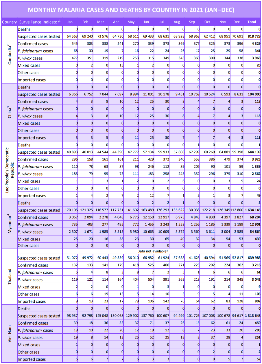 In addition to reducing malaria incidence, curbing malaria-related deaths is also considered a priority by all GMS countries. Mirroring the trend of confirmed cases, the death toll also experienced a 50% reduction, from 10 to 5 between 2020 and the following year. By reducing from one death to none, Vietnam was one of three countries, together with Cambodia and China, to reach the zero death target. Myanmar, which recorded the highest number of deaths in 2020, experienced a significant improvement by halving its death toll in 2021. In contrast, in Laos malaria mortality increased by one in 2021 (Figure 8).