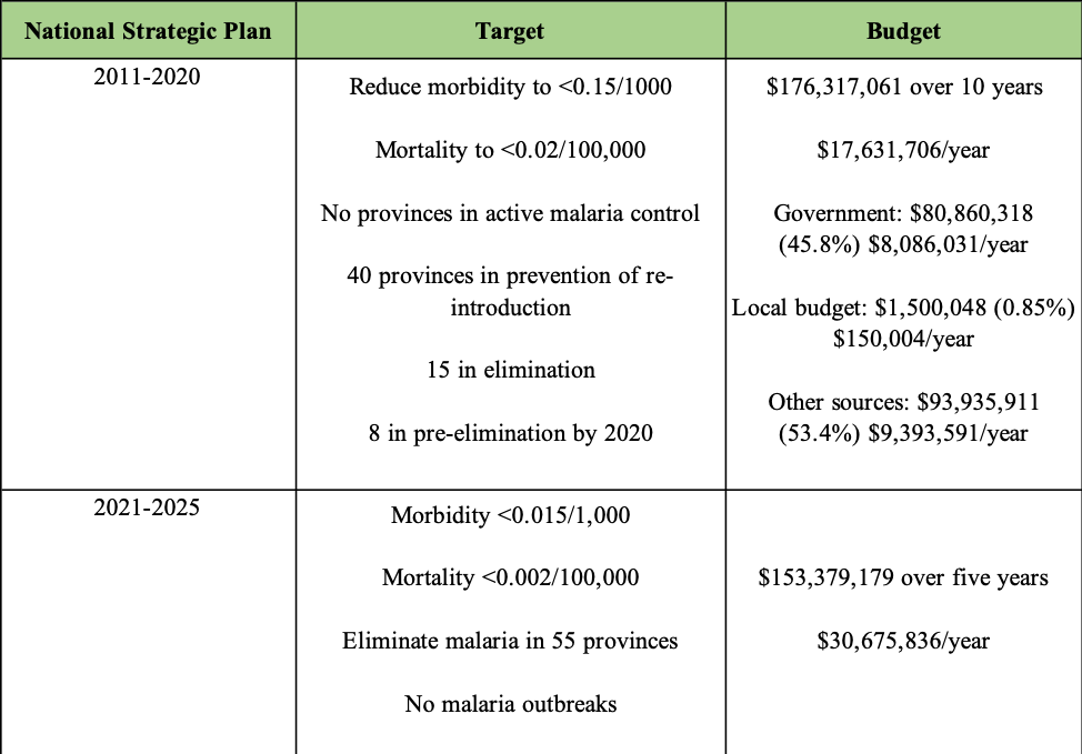 Recognizing these shortcomings, the MoH has set more aggressive goals for the current 5-year period to combat malaria: to “eliminate locally acquired P. falciparum by 2023” (MoH, 2020). The most effective methods in use at present are ACT, vector control interventions, ITNs, and insecticide IRS. Thus, intensifying these efforts are crucial to enabling the introduction of new strategies for screening and detection that aim to address the challenges of the previous phase. Since the budget shortfall over that period placed a noticeable strain on resources, the approved financial support for 2021–2025 is approximately US$30.7 million per year, doubling the previous plan of US$17.6 million annually (Table 5). In order to raise efficiency further, the plan should be adjusted annually so that flexible funding is available to increase staffing numbers, vector control interventions and treatment provision.