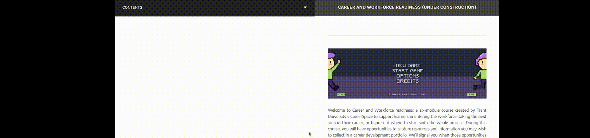 Navigating Pressbooks is easy! The table of contents can be found in the top left-hand corner, with each module being divided into chapters, and each chapter sub-divided into parts. At the bottom of the page, you’ll see three buttons that you can also use to navigate: one to go backward, one to go forward, and one that bumps you to the top of the page. You can click this link to view the corresponding gif in it’s own browser tab. [Careerspace – Trent University, Career and Workforce Readiness]